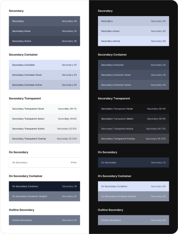 Использование Secondary позволяет сохранить визуальную иерархию, сделав интерфейс более гармоничным: элементы с этим цветом остаются заметными, но не отвлекают внимание от ключевых объектов, выделенных цветом Primary.